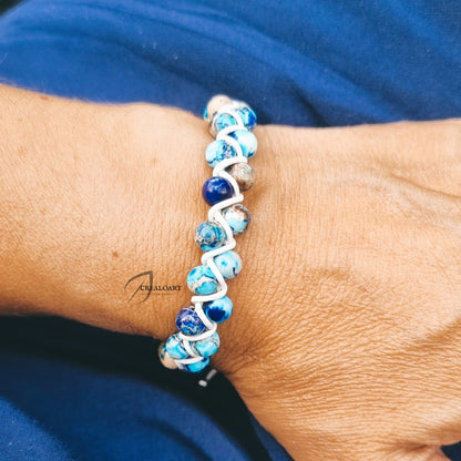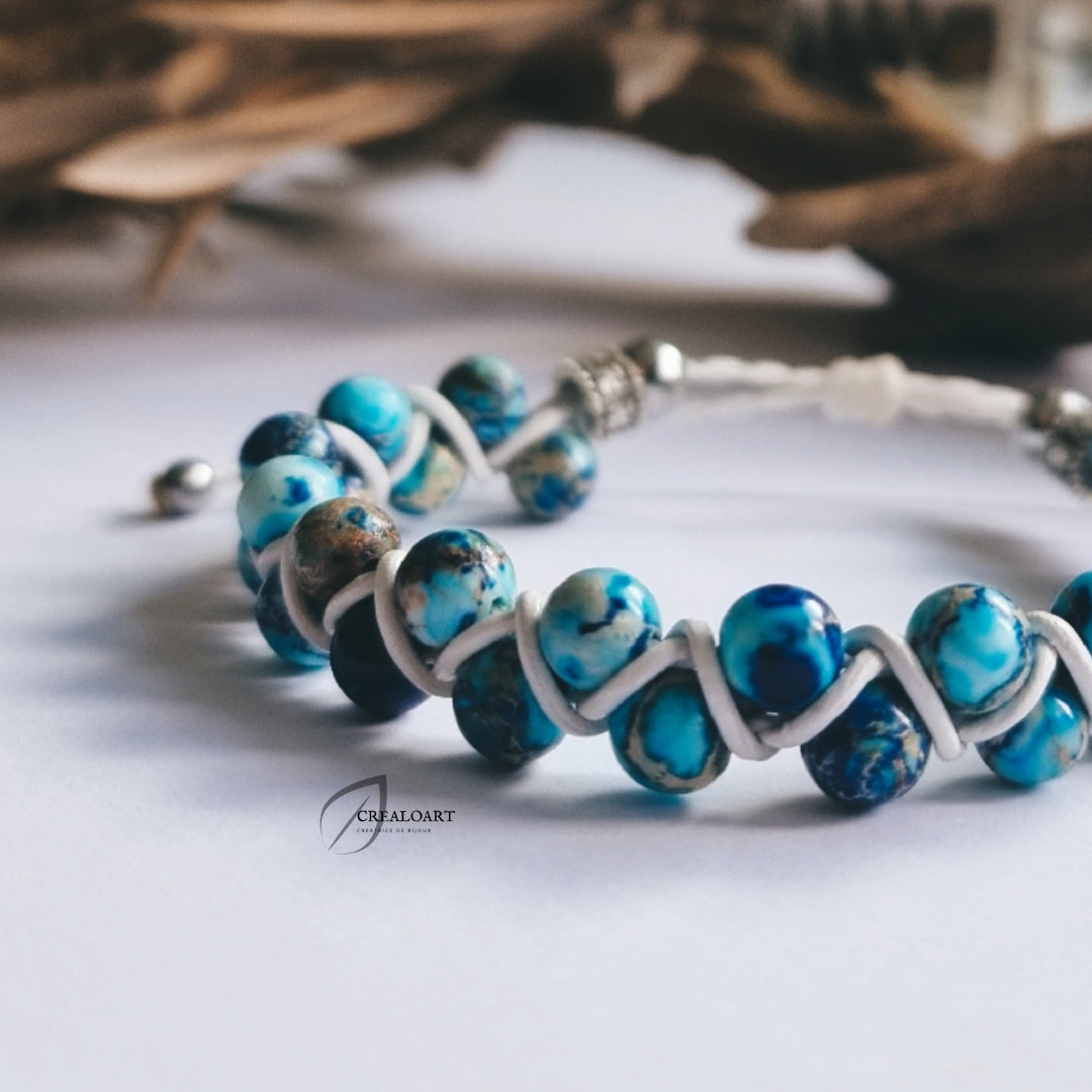Ce bracelet élégant et raffiné est parfait pour l'été. Le jaspe bleu est une pierre précieuse qui symbolise la tranquillité et la paix, tandis que le cordon en cuir beige lui confère une touche d'élégance.